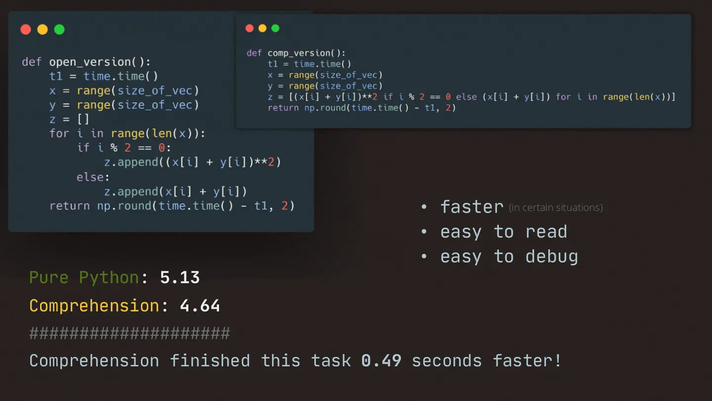 - They are easier to read and debug if they are properly used. We should avoid writing very long list comprehensions in one line to ensure that code is user-friendly.