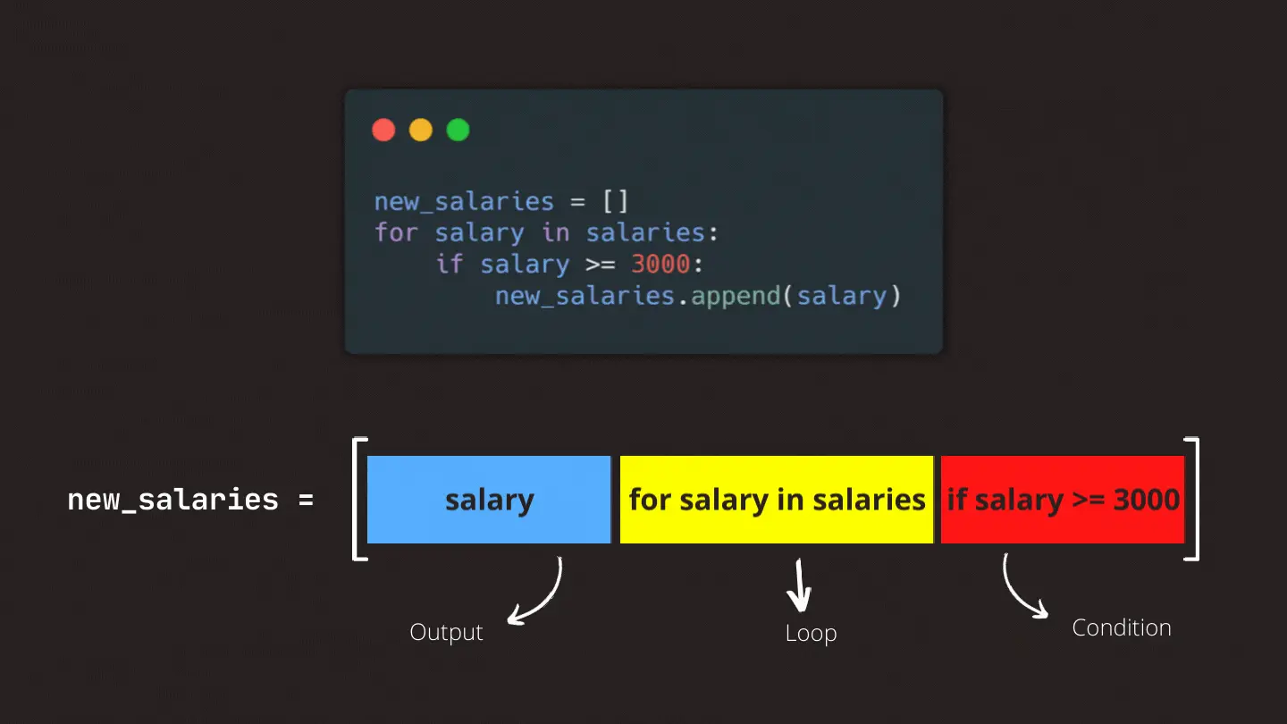 To use conditional logic with list comprehensions there are some differences in syntax depending on what we want to accomplish. If we are going to use an if condition only, we can add the expression just after the loop part of the comprehension. In this example, we are adding salaries equal to or higher than 3000 to our new list.