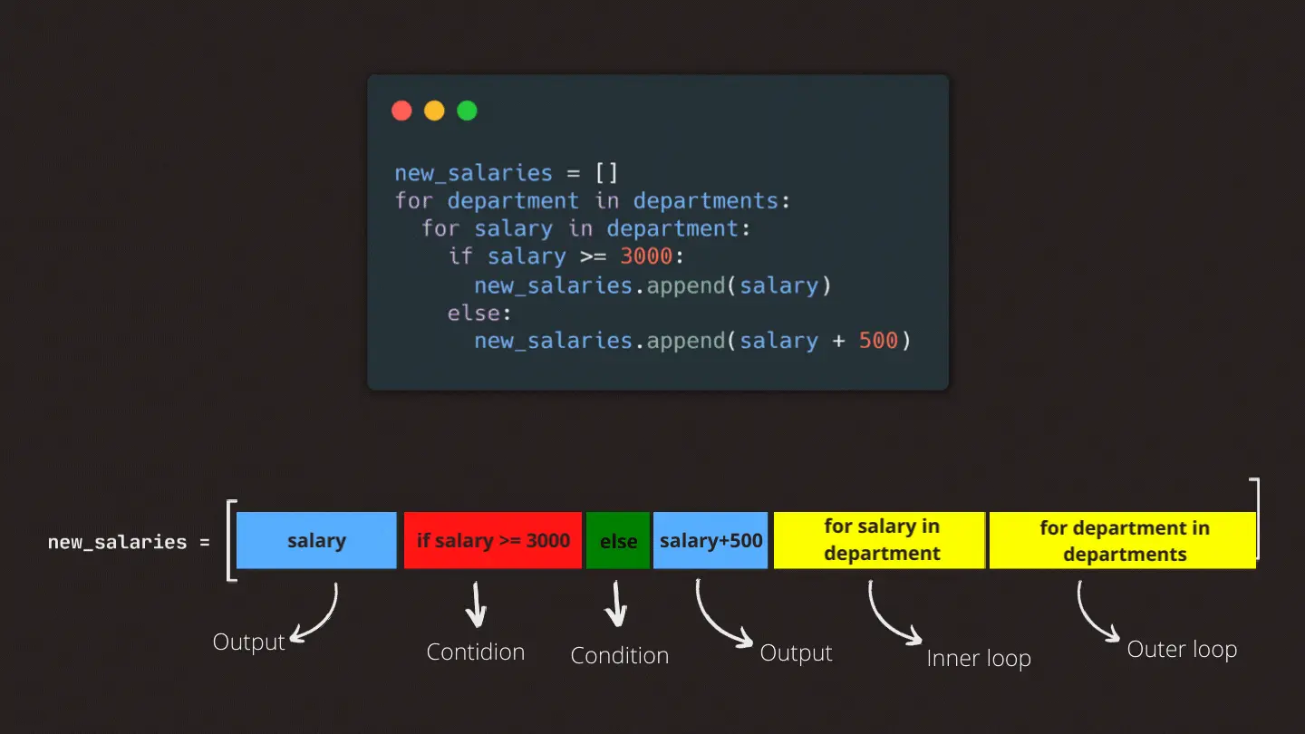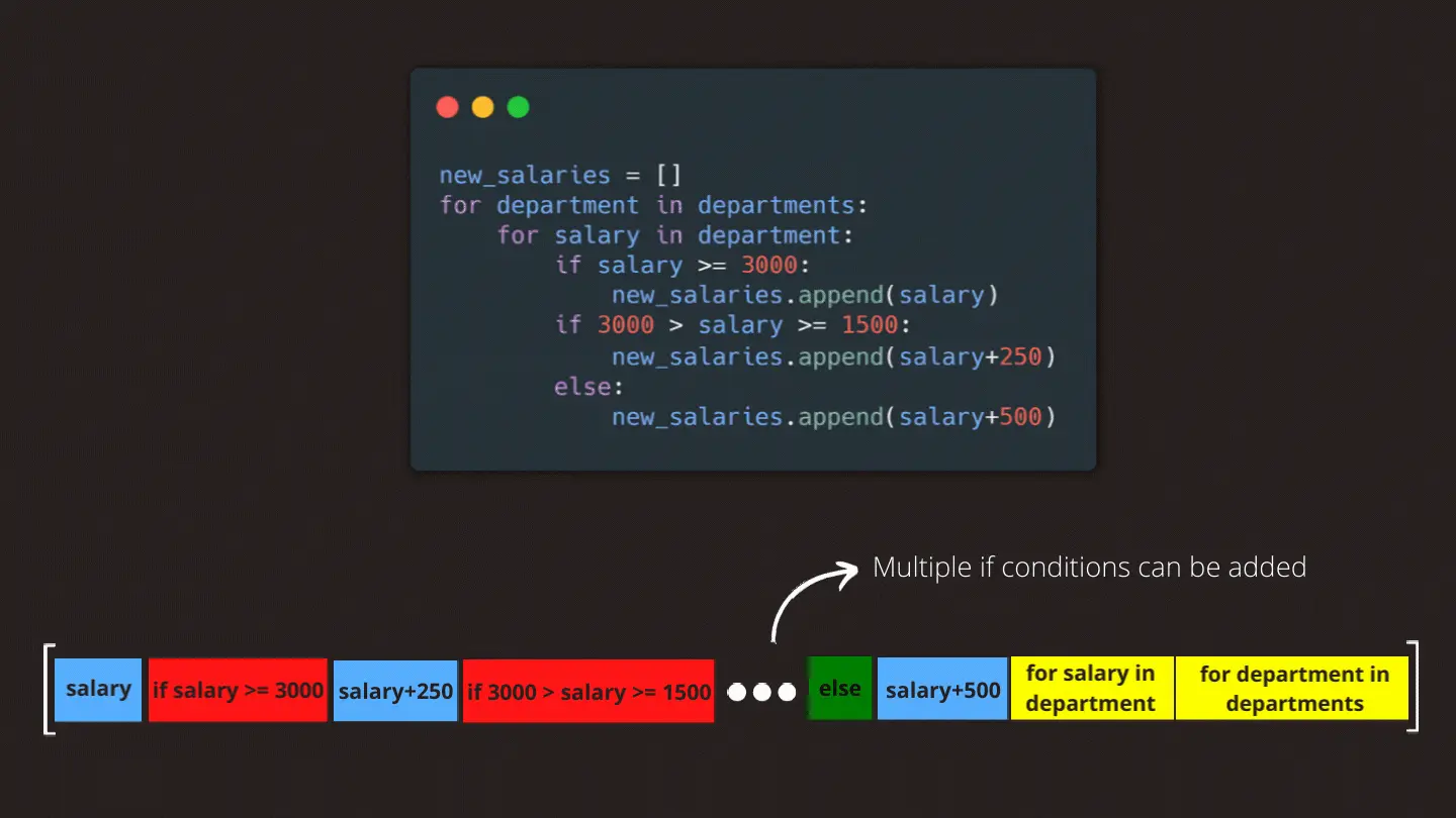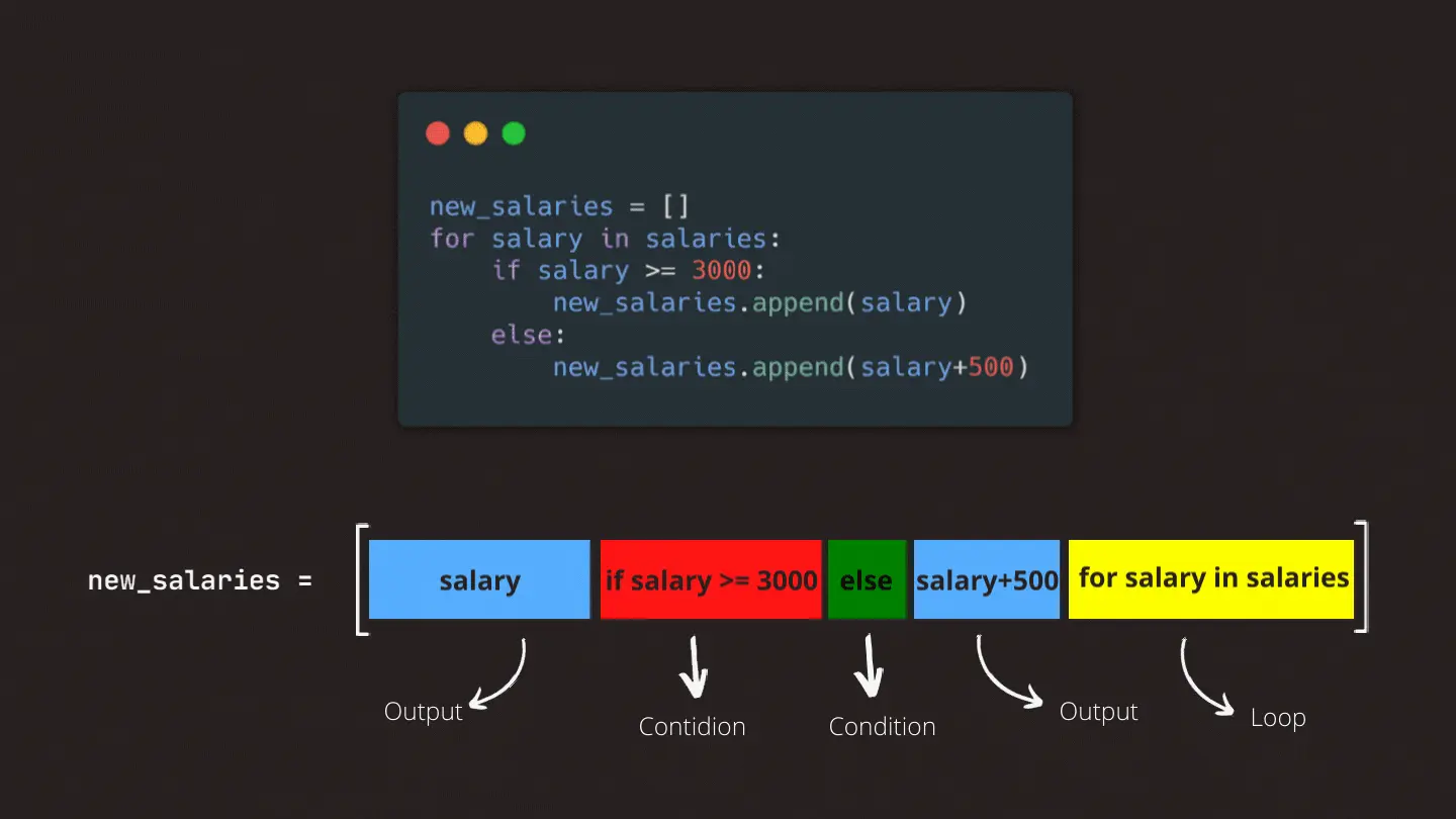 If we want to use an else statement in our comprehension, the syntax differs a bit. In this situation, we first state the output we want from our if statement, followed by the statement itself, then we add our else statement followed by the output we want to get from our else statement. And lastly, we add our for loop to the end of our list. In this example, we leave salaries equal to or higher than 3000 just as they are, and we’re giving a 500 raise to the rest.