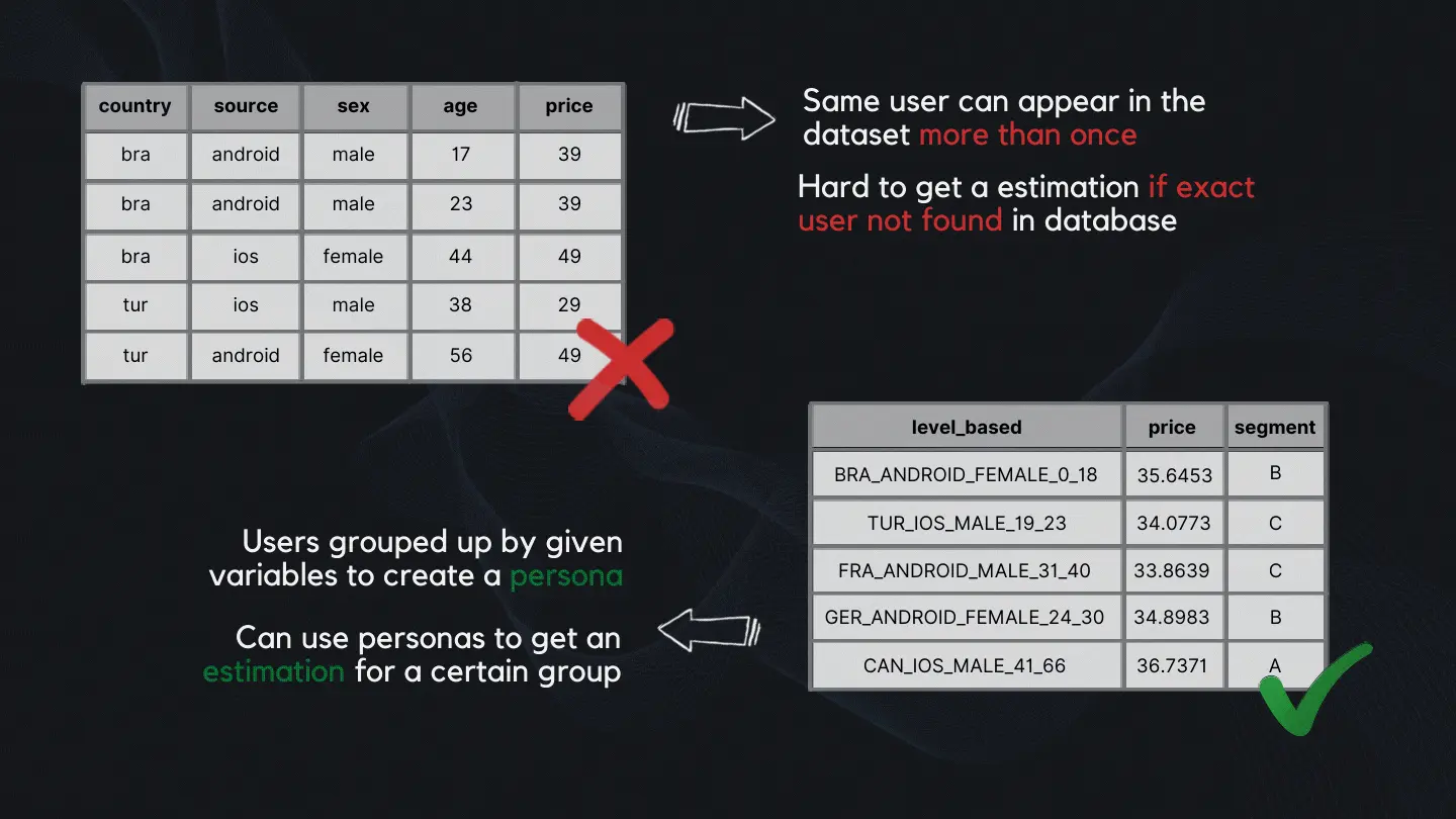 Let’s say you run a mobile app business. You can collect user data such as which country users are from, what device they are using, their gender, age, and how much money they spend using your app. After you’ve had a good amount of data, you can process this data and create segmentations and personas based on your previous or current users. After this point, you can use this knowledge to get a fast estimation about your new users, how they are likely to behave and use your application. You can use different marketing for your product based on your user’s segmentation to increase your profits.